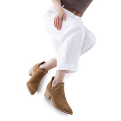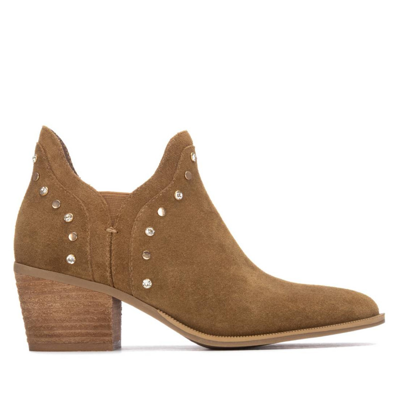 Botín de mujer, de la marca Carmela. Fabricado en serraje de alta calidad. Diseño con apliques metálicos para dar mayor elegancia. Cierre mediante elásticos laterales. Tacón ancho de 6cms y suela antideslizante. Modelo sencillo, pero en tendencia que combinará perfecto con tus looks de verano.