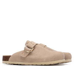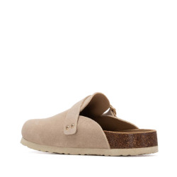 Zueco destalonado, de la marca Refresh. Fabricado en serraje. Correa decorativa en empeine con tachuelas metalizadas. Cómoda planta bios. Suela canalada de goma antideslizante.