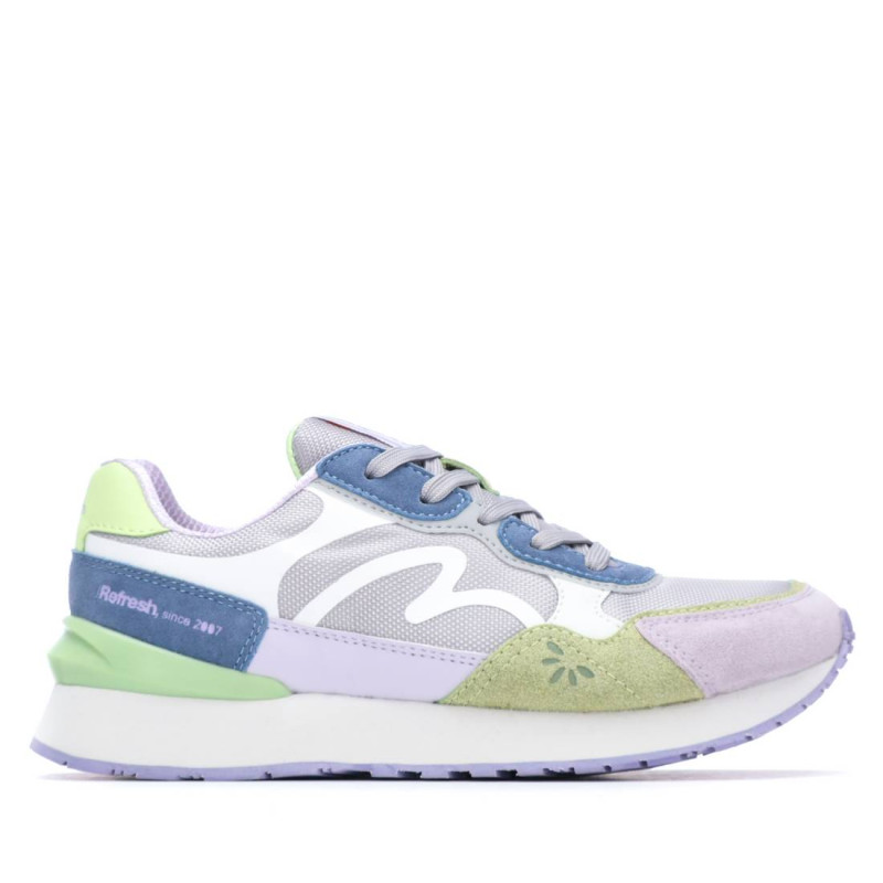 Zapatilla de mujer, de la marca Refresh. Fabricada en diferentes materiales, antelina, material que imita a la piel y tejido técnico. Cordones regulables. Gruesa suela de goma.