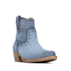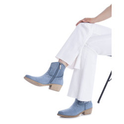 Botín de mujer, de la marca Refresh. Fabricado en antelina decorada con pequeñas tachuelas. Caña troquelada con tirador lateral. Cierre mediante cremallera interior. Cómodo botín de tacón de goma con efecto madera. Este modelo ha obtenido el certificado vegano por la organización mundial PETA (Organización de los derechos de los animales).