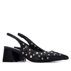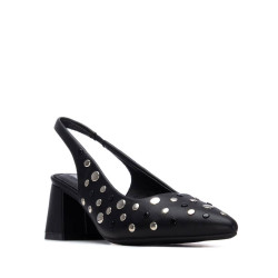 Zapato de la marca Refresh. Fabricado en material que imita a la piel decorado con tachuelas de diferentes diámetros. Elegante zapato destalonado de punta afilada. El tacón ancho de altura media garantiza estabilidad y comodidad, ideal para lucir tanto de día como de noche. Este modelo ha obtenido el certificado vegano por la organización mundial PETA (Organización de los derechos de los animales).