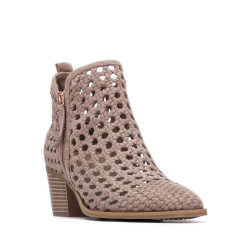 Botín de mujer, de la marca Xti. Este modelo está fabricado en una antelina trenzada con pequeños agujeros, que aporta textura y un toque artesanal muy actual. Su diseño combina elegancia y frescura, ideal para looks de entretiempo. Incorpora una cremallera exterior decorativa y otra interior funcional para mayor comodidad al calzarlo. La punta afilada y el tacón estilo cowboy con acabado efecto madera completan un botín de inspiración western con mucho estilo. Su estructura troquelada permite una mayor transpirabilidad, lo que lo convierte en una opción ideal para los días más templados. Este modelo ha obtenido el certificado vegano por la organización mundial PETA (Organización de los derechos de los animales).