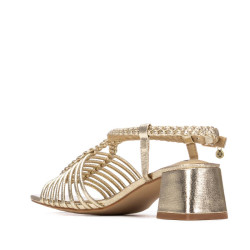 Sandalia de mujer, de la marca Xti. Fabricada en material que imita la piel con efecto metalizado, presenta un delicado diseño de tiras finas que forman una pala elegante. Cuenta con una tira que conecta la pala con la pulsera que sujeta el tobillo, ajustable mediante hebilla para mayor comodidad. Tacón ancho de 5 cm de altura que brinda estabilidad y estilo, perfecta para un look sofisticado y cómodo. Este modelo ha obtenido el certificado vegano por la organización mundial PETA (Organización de los derechos de los animales).