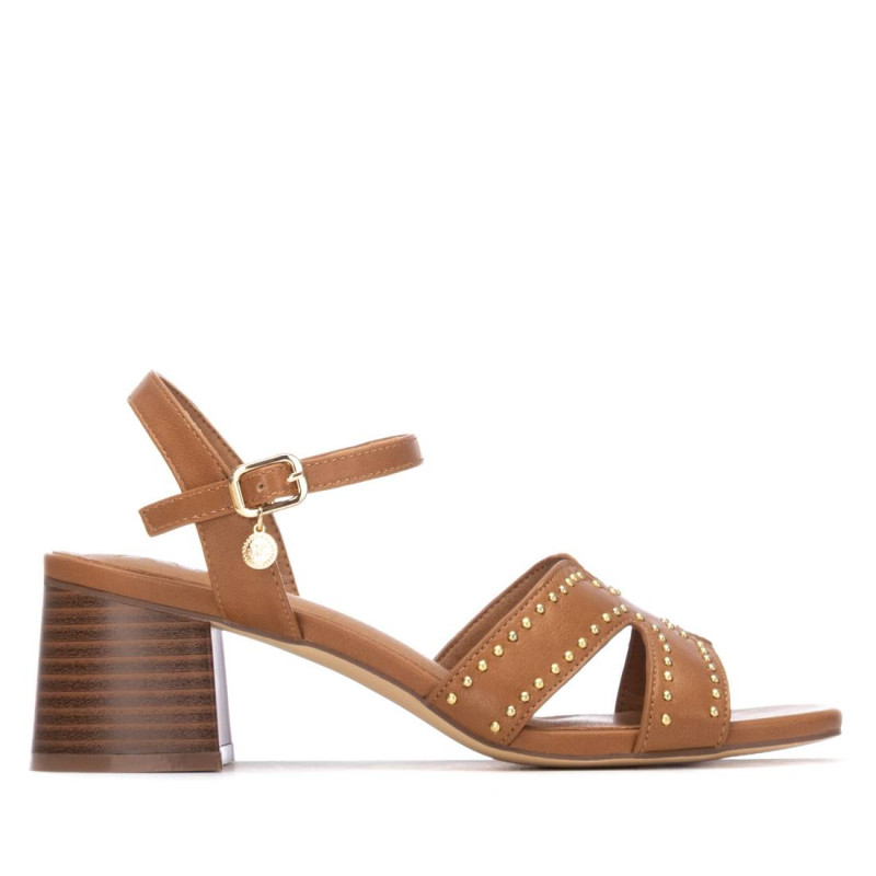 Sandalia de mujer, de la marca Xti. Fabricada en material que imita la piel, presenta un bonito diseño de pala decorada con mini tachas que aportan un toque moderno y elegante. Cuenta con tacón ancho que brinda estabilidad y comodidad, ideal para llevar todo el día con estilo. Este modelo ha obtenido el certificado vegano por la organización mundial PETA (Organización de los derechos de los animales).