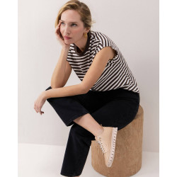 Zapatilla casual de mujer, de la marca Carmela. Fabricada en piel de alta calidad. Diseño con colorido ideal para esta temporada y apliques metálicos que aportan elegancia. Cierre mediante cordonera ajustable. Suela de goma antideslizante. Con plantilla extraíble.