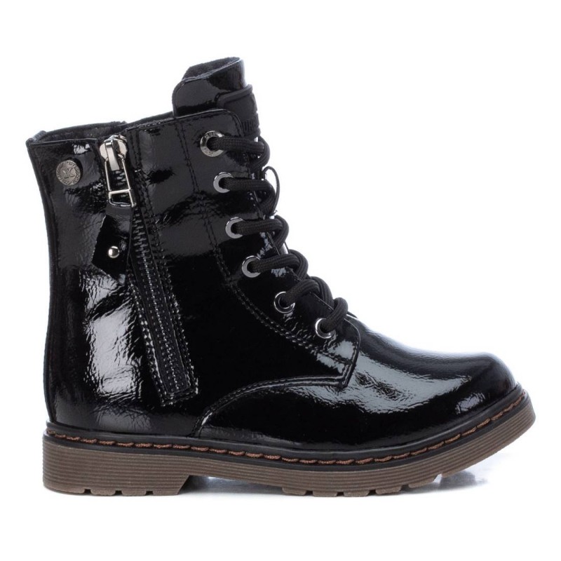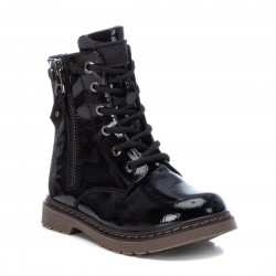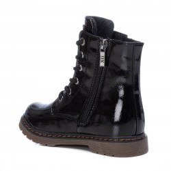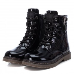 Botín de niña, de la marca Xti Kids. Fabricado en material que imita la piel con efecto charol. Cierre mediante cremallera interna. Con cremallera exterior decorativa. Cordones al tono para un mejor ajuste. Gruesa suela de goma antideslizante. Este modelo ha obtenido el certificado vegano por la organización mundial PETA (Organización de los derechos de los animales).