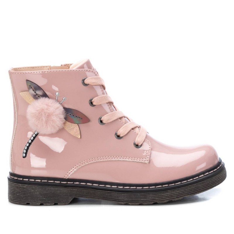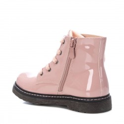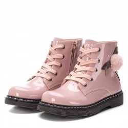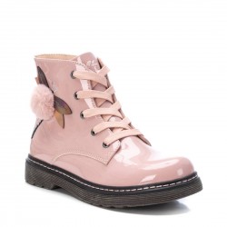 Botín de niña, de la marca Xti Kids. Fabricado en charol. Con un bonito detalle de liberula en su lateral formado con diferentes materiales y completado con un pom pom. Combinala con todos los looks de tu pequeña. Cierre mediante cremallera interior. Altura de la caña: 10 cm. Con suela rayada de goma antideslizante. Este modelo ha obtenido el certificado vegano por la organización mundial PETA (Organización de los derechos de los animales).