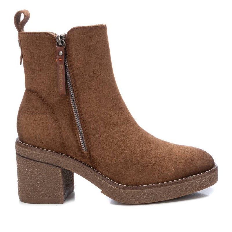 Botín de mujer, de la marca Refresh. Fabricado en antelina. Cierre mediante cremallera lateral. Tirador trasero para facilitar la puesta. Cremallera decorativa en el lateral exterior. Tacón ancho de 7 cm con plataforma delantera para mayor comodidad. Suela de goma antideslizante. Este modelo ha obtenido el certificado vegano por la organización mundial PETA (Organización de los derechos de los animales).