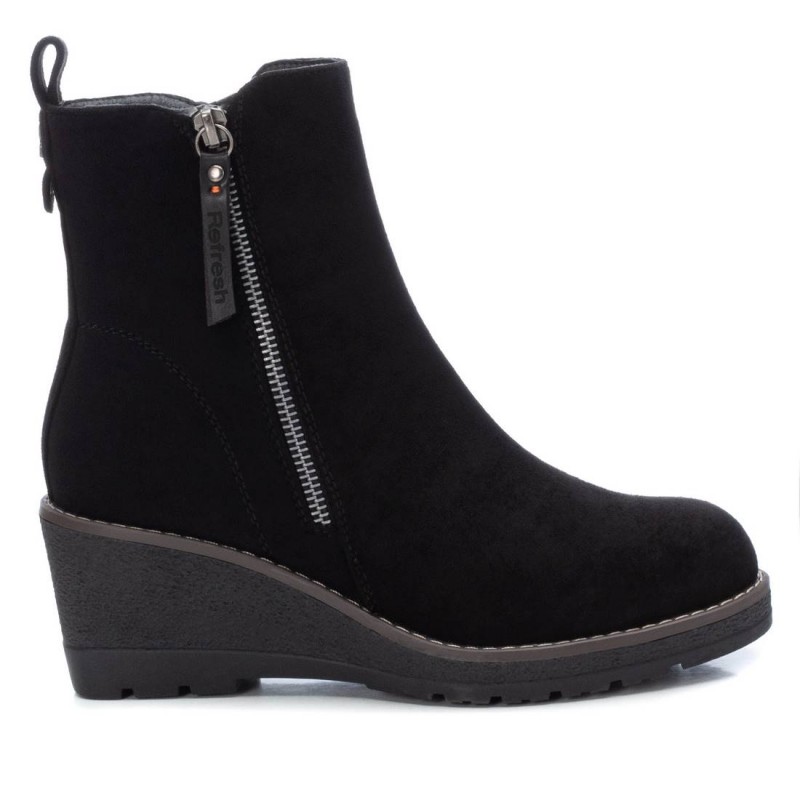 Botín de mujer, de la marca Refresh. Fabricado en antelina. Cierre mediante cremallera lateral. Tirador trasero para facilitar la puesta. Cremallera lateral decorativa. Cómoda cuña de 6 cm con suela de goma antideslizante. Este modelo ha obtenido el certificado vegano por la organización mundial PETA (Organización de los derechos de los animales).