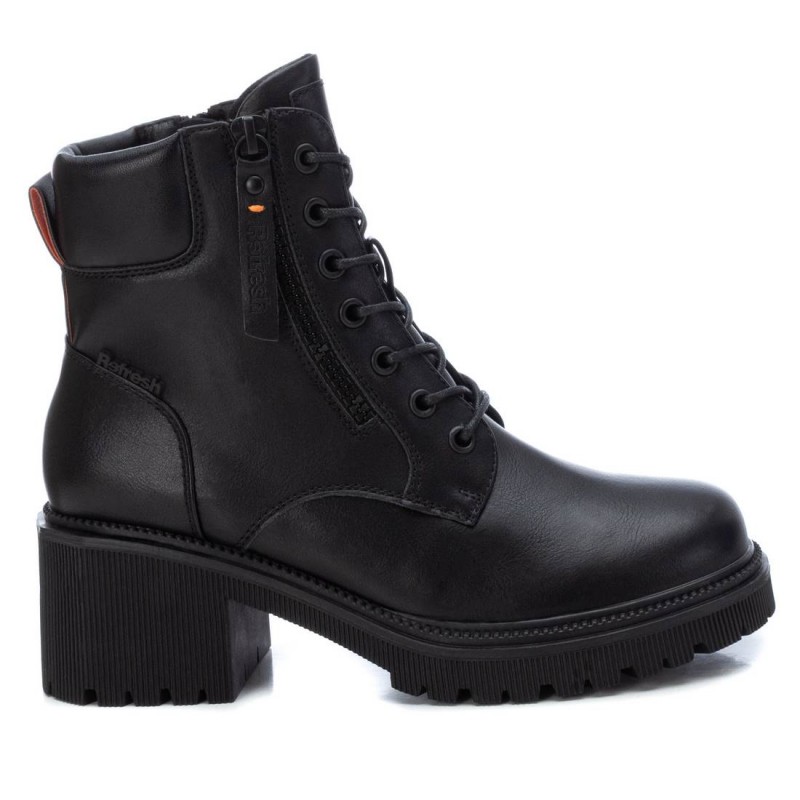 Botín de mujer, de la marca Refresh. Fabricado en material que imita la piel. Cierre mediante cremallera y cordones para un buen ajuste. Tirador trasero para facilitar la puesta. Cremallera lateral decorativa y collarín acolchado. Cómodo tacón ancho de 6 cm con suela dentada antideslizante. Este modelo ha obtenido el certificado vegano por la organización mundial PETA (Organización de los derechos de los animales).