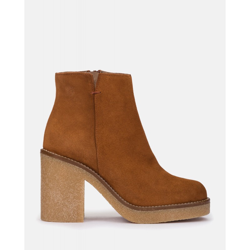 Botín GELA 001 de color cuero con un tacón de 9 cm con corte exterior de piel vacuna, e interior de piel porcina y textil, para un mayor confort y suavidad. Fabricado en España. Diseñado con una suela clarita que hace resaltar el color del botín mientras proporciona la mayor comodidad posible. Diseño distinto para lucir estilosa este invierno. Gran flexibilidad. Plantilla acolchada y antideslizante que añade un extra de comodidad. Elaborado mediante un proceso de fabricación artesanal que usa tintes vegetales y embalajes sostenibles para respetar el medio ambiente.