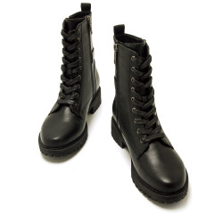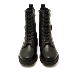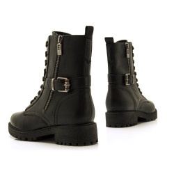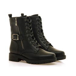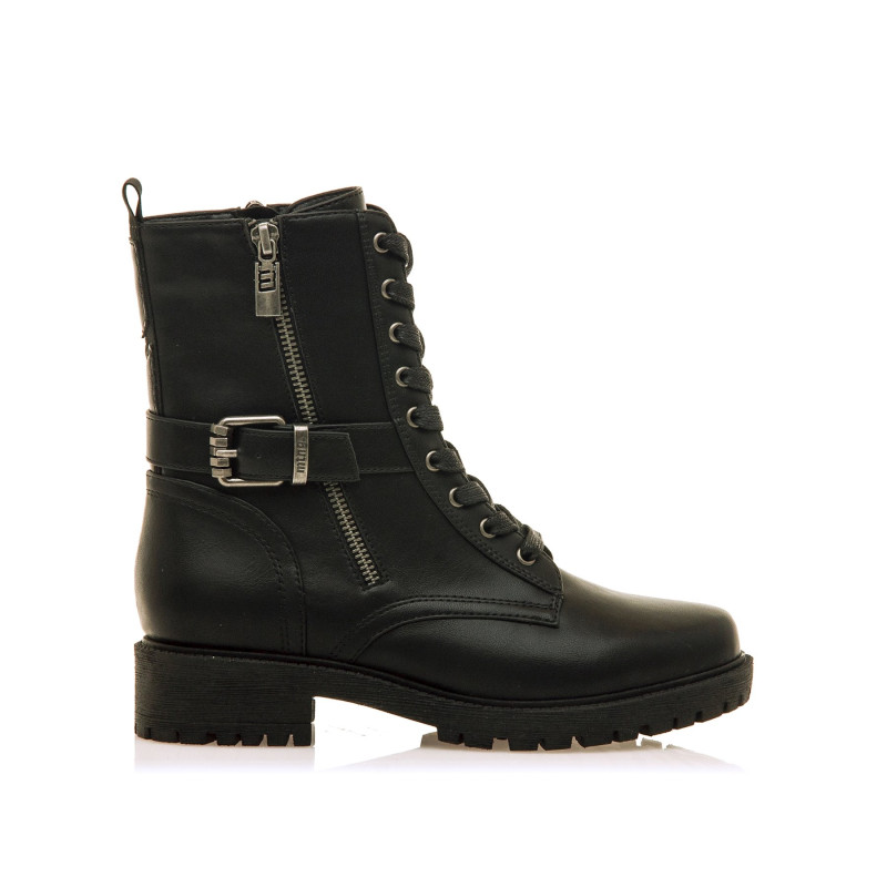 Botín plano Campa mtng para mujer. De estilo biker urbano de color negro con cierre de cordoneras. Destacan especialmente por su tira en el empeine acabada en una hebilla decorativa. Cierre de cremallera en la parte interior. Tachuela con el logo de la marca. Horma redondeada. Serán la opción perfecta para tu día a día.