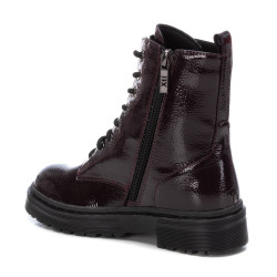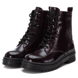 Botín de niña, de la marca Xti Kids. Fabricado en charol arrugado. Cordones regulables para un mejor ajuste. Tirador trasero para facilitar el calce. Cierre mediante cremallera interior. Con doble suela de goma antideslizante. Este modelo ha obtenido el certificado vegano por la organización mundial PETA (Organización de los derechos de los animales).