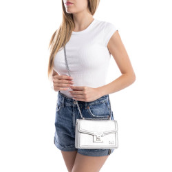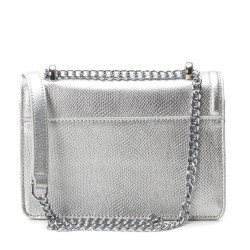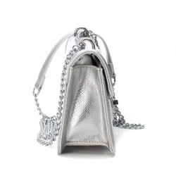 Bolso pequeño metalizado, marca Xti. Fabricado en material que imita la piel, colores metalizados. Cadena regulable para llevar al hombro o bandolera. Bolso combinable con tus looks veraniegos más elegantes. Medidas 14x18x8 cm. Este modelo ha obtenido el certificado vegano por la organización mundial PETA (Organización de los derechos de los animales).