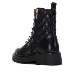 Botín de mujer, de la marca Xti Basic. Fabricado en material que imita la piel, con un bonito diseño de cosido de rombos en el lateral, que aporta un toque distintivo y elegante. Estilo militar, con cremallera al lado de los cordones y también cremallera interior para facilitar la puesta y asegurar un ajuste perfecto. Su suela plana antideslizante garantiza comodidad, estabilidad y tracción en diversas superficies. Un Botín ideal para un look moderno y con carácter. Este modelo ha obtenido el certificado vegano por la organización mundial PETA (Organización de los derechos de los animales).