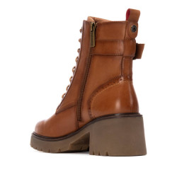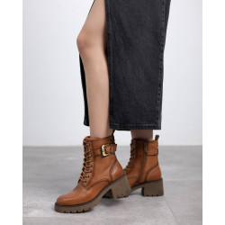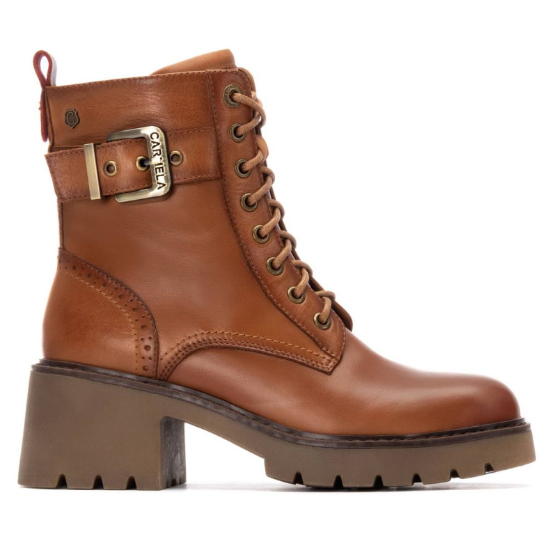Botín de mujer, de la marca Carmela. Fabricado en piel de alta calidad. Cierre mediante cremallera interna. Detalle al frente de cordones y hebilla lateral. Tirador trasero para facilitar la puesta. Suela de goma antideslizante. Plantilla extraíble