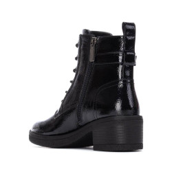 Botín de mujer, de la marca Carmela. Fabricado en charol. Cierre mediante cremallera interna. Detalle al frente de cordones y hebilla lateral. Tirador trasero para facilitar la puesta. Suela de goma antideslizante. Plantilla extraíble