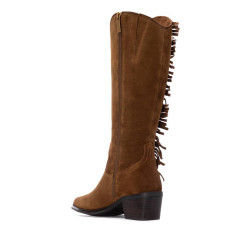 Bota de mujer, de la marca Carmela. Fabricado en un suave serraje. Detalle lateral con tachuelas pequeñas y flecos. Plantilla extraíble