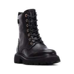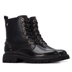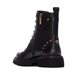 Botín de mujer, de la marca Carmela. Fabricado en material que imita la piel con bonito decorado en estampado animal. Cordones ajustables. Detalles traseros de tachuelas pequeñas. Suela gruesa de goma antideslizante. Plantilla extraíble