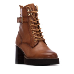Botín de mujer, de la marca Carmela. Fabricado en piel de alta calidad. Cierre mediante cremallera y cordones ajustables. Decorado lateral con hebilla. Tirador trasero para facilitar la puesta. Suela de goma antideslizante. Plantilla extraíble