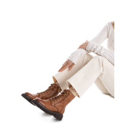 Botín de mujer, de la marca Carmela. Fabricado en piel de alta calidad. Cierre mediante cremallera interna y cordones ajustables. Detalles en el talón de tachas metalizadas. Tirador trasero para facilitar la puesta. Suela de goma antideslizante. Plantilla extraíble