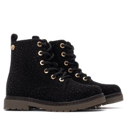 Botín estilo militar de niña, de la marca Xti Kids. Fabricado en suave antelina, con cordones frontales y cremallera lateral que facilita el calce. El modelo está decorado con pequeños cristales al tono distribuidos por toda la superficie, aportando un toque delicado y elegante sin perder su estilo resistente. Suela de goma que ofrece comodidad y buen agarre. Perfecto para un look con carácter y un toque brillante. Este modelo ha obtenido el certificado vegano por la organización mundial PETA (Organización de los derechos de los animales).