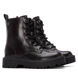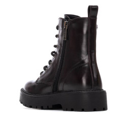 Botín militar de niña, de la marca Xti Kids. Fabricado en material charol que imita la piel, con un acabado brillante y moderno. Presenta un diseño robusto con cordones en el frontal y cremallera lateral para un calce fácil y seguro. La suela de goma gruesa y dentada ofrece buena tracción y resistencia. Ideal para darle un toque urbano y con carácter a cualquier look. Este modelo ha obtenido el certificado vegano por la organización mundial PETA (Organización de los derechos de los animales).