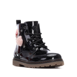Botín estilo militar de niña, de la marca Xti Kids. Fabricado en charol con acabado glitter que aporta un brillo llamativo y moderno. Presenta un detalle decorativo cosido en el lateral con forma de erizo de animal, que añade un toque divertido y original al diseño. Suela de goma resistente que proporciona comodidad y buen agarre. Perfecto para un look con personalidad y estilo único.