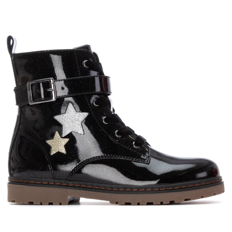 Botín estilo militar de niña, de la marca Xti Kids. Fabricado en charol con acabado glitter que aporta un brillo llamativo y moderno. Presenta estrellas decorativas en el lateral que añaden un toque divertido y estilizado. Además, cuenta con una tira lateral con hebilla que aporta un detalle original y elegante al diseño. Suela de goma resistente que garantiza comodidad y buen agarre. Perfecto para un look con personalidad y estilo único.