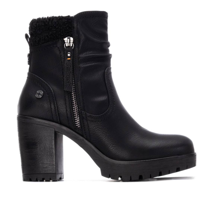 Botín de mujer, de la marca Refresh. Fabricado en material que imita a la piel acabado cepillado. Cremallera lateral decorativa. Cierre mediante cremallera interior. Tacón de 9 cm con suela de goma. Plantilla extraíble. Un Botín perfecto para el día a día. Este modelo ha obtenido el certificado vegano por la organización mundial PETA (Organización de los derechos de los animales).