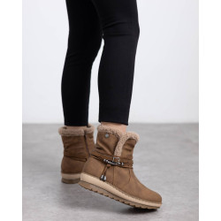 Botín de mujer, de la marca Refresh. Fabricado en material que imita la piel. Cierre mediante cremallera interior. Cintas al tobillo decorativas. Forro de borrego sintético ideal para los días más fríos. Gruesa suela de goma antideslizante.