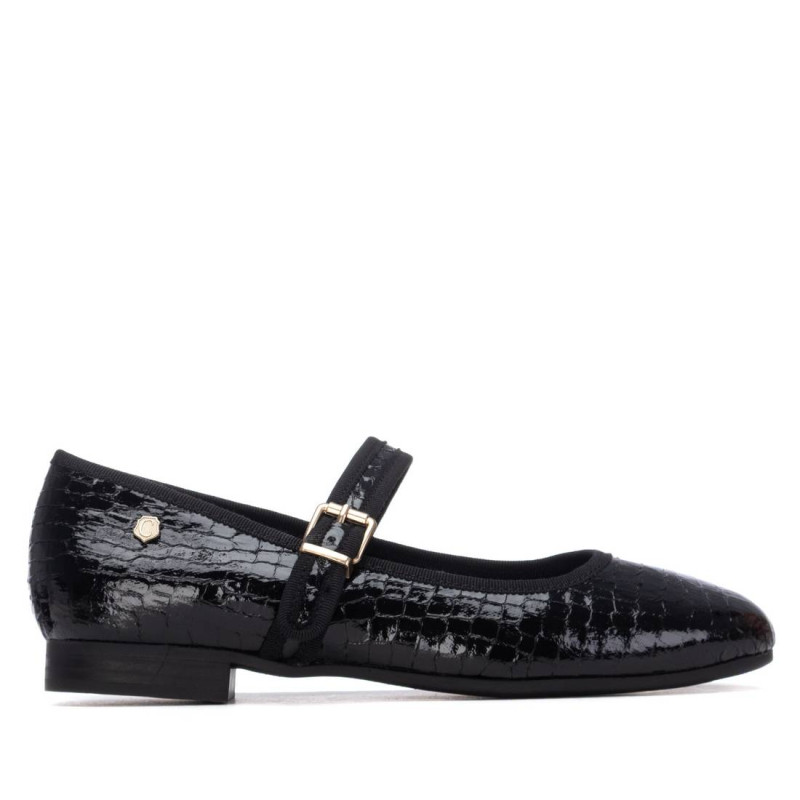 Zapato de mujer, de la marca Carmela. Fabricado en material que imita la piel con decorado de estampado. Estilo bailarina con sujeción mediante hebilla. Cómoda suela plana, antideslizante. Plantilla extraíble
