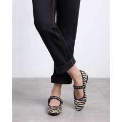 Zapato de mujer, de la marca Carmela. Fabricado en material que imita la piel con decorado de estampado. Estilo bailarina con sujeción mediante hebilla. Cómoda suela plana, antideslizante. Plantilla extraíble