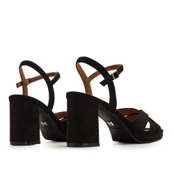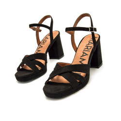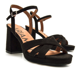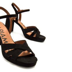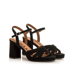 Sandalias negras de tacón para mujer de la marca Mariamare, modelo Cefalu. Este modelo combina un diseño clásico con textura afelpada y tiras cruzadas en la parte delantera que aportan un toque atemporal y femenino. La pulsera ajustable al tobillo asegura un ajuste cómodo, mientras que el tacón ancho proporciona una pisada estable. Perfectas para cualquier evento formal, estas sandalias son un básico imprescindible en cualquier armario.