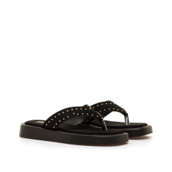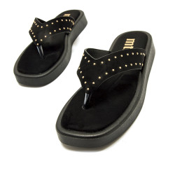 Sandalia de dedo con plataforma para mujer de la marca mtng, modelo Maby de color negro. Destaca por su diseño de estilo esclava en V con suela elevada, y decoración de tachas doradas, que aportan un toque actual sin perder versatilidad. La forma de las tiras favorece la sujeción del pie y mantiene una estética limpia, mientras que su planta acolchada con tecnología Comfort aporta comodidad durante su uso. Con certificado VEGANO sellado por INESCOP, el cual garantiza que la naturaleza química principal del material no se corresponde con fibras de origen animal.