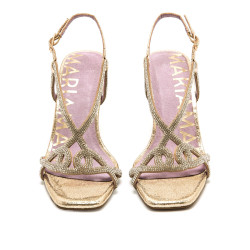 Sandalias doradas de tacón para mujer de la marca Mariamare, modelo Nuin. Este diseño destaca por sus delicadas tiras adornadas con pedrería brillante que aportan un toque elegante. La puntera abierta y el cierre ajustable con hebilla garantizan comodidad y sujeción, mientras que el tacón con forma acampanada añade un aire sofisticado. Ideales para eventos especiales o para realzar tus looks de noche con estilo y glamour.