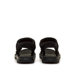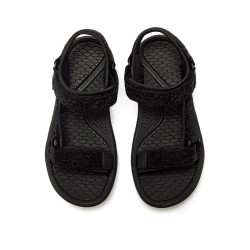 Sandalia de color negro con un toque brillante para mujer, modelo Solana de la marca Mtng, con diseño deportivo y funcional pensado para ofrecer comodidad. Incorpora doble cierre adhesivo que permite un ajuste personalizado, mientras que la suela negra de goma con relieve favorece una pisada más firme. Su estructura ligera y acolchada es ideal para quienes buscan practicidad sin renunciar al estilo. Perfecta para climas cálidos gracias a su diseño abierto. Con certificado VEGANO sellado por INESCOP, el cual garantiza que la naturaleza química principal del material no se corresponde con fibras de origen animal.