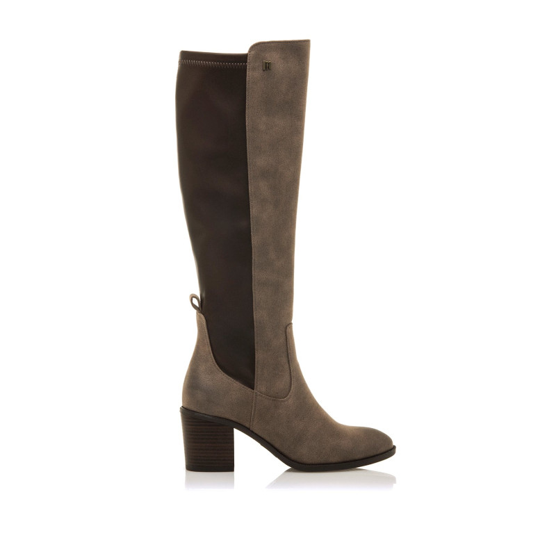 Bota alta de color taupe para mujer, modelo Miriana de la marca MTNG. Su caña alta incorpora un panel trasero elástico más oscuro que mejora el ajuste y la comodidad en cada uso. Incluye cremallera lateral para facilitar el calce y su acabado en tono neutro la convierte en una opción versátil. Esta bota campera es perfecta para combinar con looks casuales durante los meses fríos, aportando estilo y funcionalidad. Fabricado con un 60% de algodón reciclado post consumo y un 40% de algodón convencional