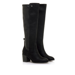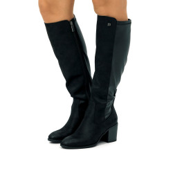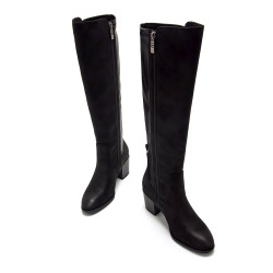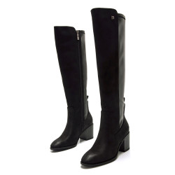Bota alta de color negro para mujer de la marca MTNG, modelo Miriana, de estilo campera con tacón medio. Diseñada con una caña recta y cierre lateral con cremallera, esta bota ofrece un ajuste cómodo y fácil de poner. Su diseño minimalista y versátil combina fácilmente con distintos looks del día a día, aportando un toque moderno y funcional. Ideal para los meses más fríos, su tacón ancho proporciona estabilidad y confort durante todo el día. Fabricado con un 60% de algodón reciclado post consumo y un 40% de algodón convencional.