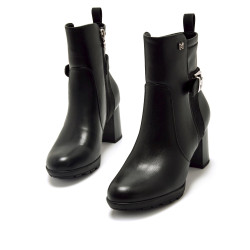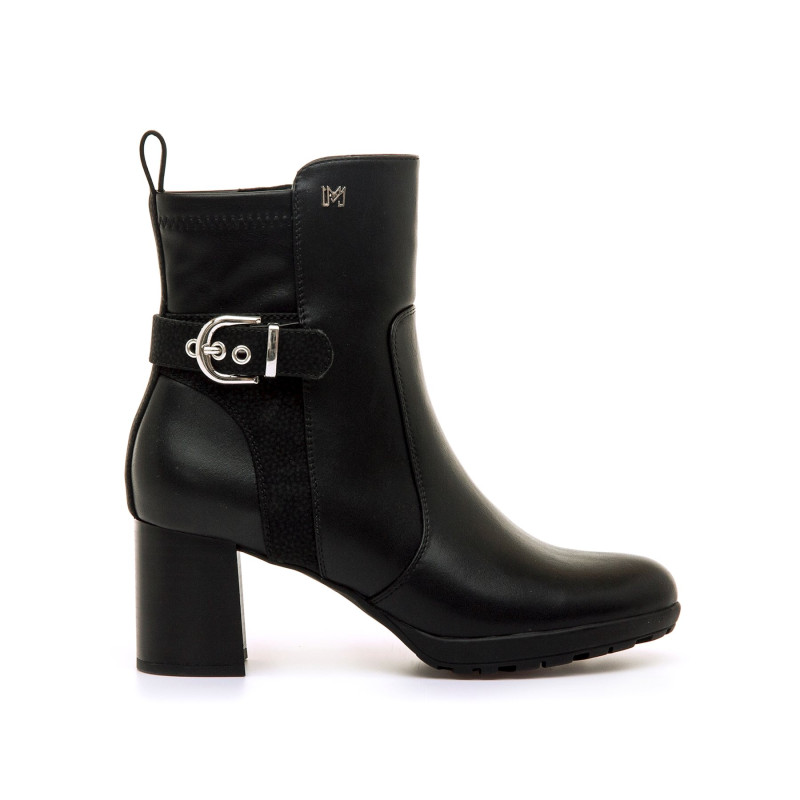 Botín de tacón de color negro para mujer de Mariamare, modelo Polino. Con diseño liso y detalle lateral de hebilla metálica que aporta un toque decorativo sin recargar el conjunto. Su caña media y tacón ancho lo hacen ideal para uso diario, ofreciendo estabilidad y comodidad. El cierre lateral con cremallera facilita su colocación. Un modelo versátil que combina fácilmente con prendas de estilo casual o de oficina.