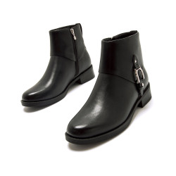 Botín de estilo ecuestre de color negro para mujer, modelo Laglio de Mariamare. Este modelo incorpora una hebilla metálica lateral inspirada en el estilo hípico, que aporta carácter sin recargar el conjunto. Su caña baja y estructura limpia lo hacen fácil de combinar con vaqueros ajustados o vestidos. El cierre con cremallera facilita el ajuste y la suela baja ofrece comodidad para el uso diario. Una opción versátil para quienes buscan un toque clásico con aire moderno.