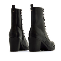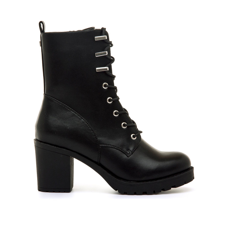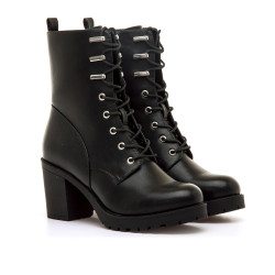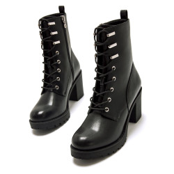 Botines de tacón de color negro para mujer de Mariamare, modelo Pompei de estilo militar. Con diseño de caña media y cierre de cordones que aporta un estilo urbano. El tacón ancho y la suela dentada ofrecen una pisada firme, ideal para caminar con seguridad. Las piezas metálicas en la parte superior refuerzan su estética actual y funcional. Perfecta para looks casuales o con prendas más ajustadas, esta bota combina estilo y comodidad para el día a día.