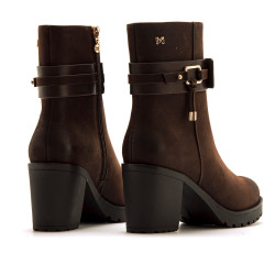 Botines de tacón color moka para mujer, modelo Pompei de Mariamare. Su acabado aterciopelado se combina con una doble tira decorativa con hebilla metálica dorada en el lateral, aportando un toque distintivo. La suela con relieve garantiza un buen agarre, mientras que el cierre lateral facilita el calce. El tacón ancho proporciona estabilidad y comodidad, perfectos para los días de frío con un toque de estilo.