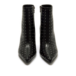 Botines negros de tacón para mujer de Mariamare, modelo Nuoro. Este diseño destaca por su acabado con mini tachuelas metálicas distribuidas uniformemente, que aportan textura y un toque llamativo. La punta afilada y el tacón de aguja estilizan la silueta, ideal para looks más arreglados o de noche. Incorpora cremallera lateral para facilitar el calce y un ajuste ceñido al tobillo. Perfecto para elevar cualquier conjunto con un toque actual.