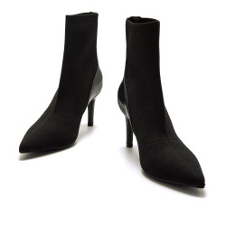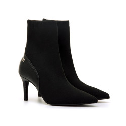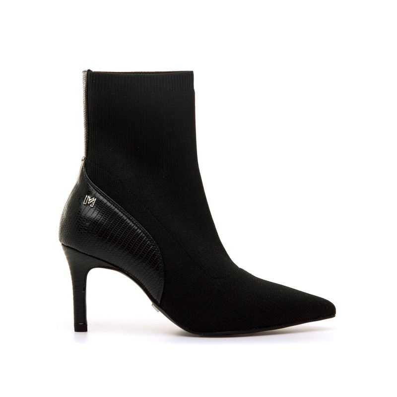 Botines negros de tacón para mujer, modelo Nuoro de Mariamare con diseño tipo calcetín. Su ajuste elástico se adapta al pie y al tobillo, ofreciendo una sensación cómoda y estilizada. La puntera fina y el detalle texturizado en la parte trasera aportan un toque moderno y elegante. El tacón alto realza la figura sin renunciar a la estabilidad.