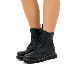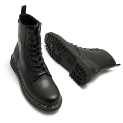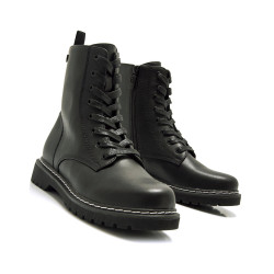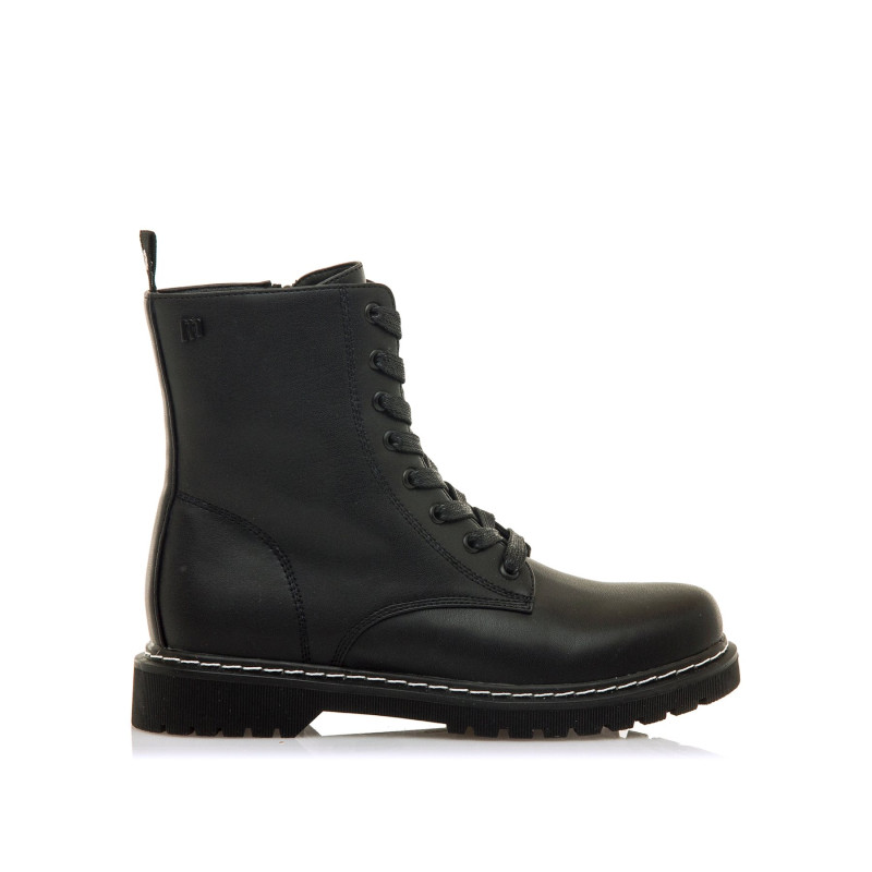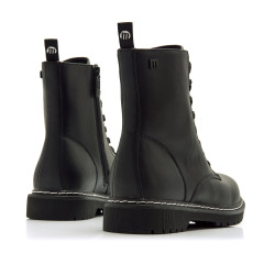 Botín de color negro para mujer modelo Storm de estilo militar, marca Mtng. Este diseño incorpora un corte tipo militar con cordones al frente acompañados de una cremallera interior y un tirador trasero para facilitar el calce. La suela de plataforma gruesa y dentada añade un toque urbano y mejora la tracción, mientras que el pespunte decorativo de color blanco en la base crea un contraste atractivo. Perfecto para completar looks casuales con un aire rebelde y actual.