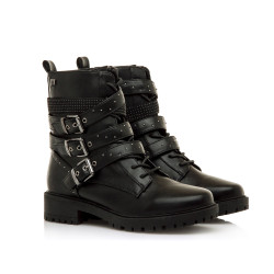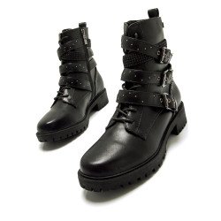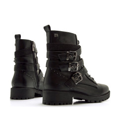 Botines de color negro para mujer de la marca Mtng, modelo Campa de estilo mlitar. Este diseño combina cordones frontales con tres tiras decorativas de hebilla metálica y detalles de tachuelas, aportando un toque cañero ideal para looks urbanos. La suela gruesa con relieve mejora la tracción, mientras que el tirador trasero y la cremallera lateral facilita su colocación. Perfecta para añadir personalidad al día a día con un calzado resistente y con carácter. Fabricado con un 60% de algodón reciclado post consumo y un 40% de algodón convencional.