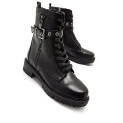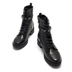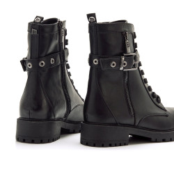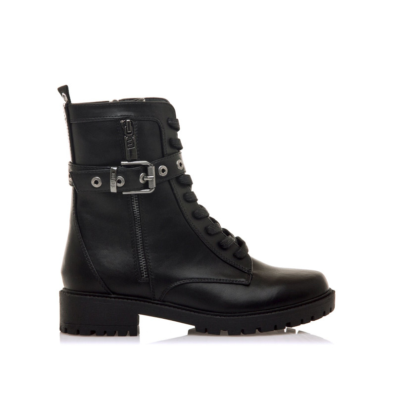 Botín Campa de estilo biker de color negro para mujer de MTNG. Con una silueta robusta y detalles metálicos, incorpora cordones, cremallera lateral y una correa con hebilla decorativa para un ajuste seguro y atractivo. La suela dentada proporciona buena tracción, mientras que el acabado liso le da un toque versátil para el uso diario con un aire militar marcado. Fabricado con un 60% de algodón reciclado post consumo y un 40% de algodón convencional.