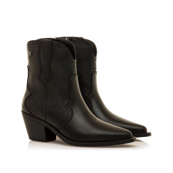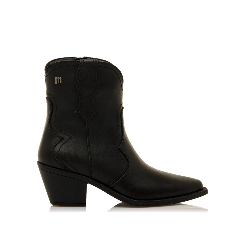 Botines negros de mujer marca Mtng, modelo Daphne de estilo cowboy. Su diseño minimalista con costuras decorativas mantiene la esencia western en una versión más sobria y versátil. El cierre con cremallera lateral permite un ajuste rápido y cómodo, mientras que el tacón medio de base ancha ofrece estabilidad. Ideal para dar un toque actual a cualquier conjunto urbano o casual. Fabricado con piel que proviene de fabricantes aprobados por el protocolo «Leather Working Group», donde evalúan el cumplimiento ambiental y el desempeño, promoviendo prácticas comerciales ambientales sostenibles dentro de la industria del cuero.