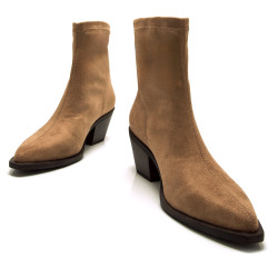 Botines de tacón para mujer marca Mtng, modelo Daphne de color arena, estilo cowboy. Confeccionado en microfibra, este diseño de caña ajustada y puntera afilada estiliza la silueta del pie, mientras que el tacón medio ancho aporta estabilidad. Un modelo versátil y funcional que se adapta fácilmente a looks urbanos o de inspiración boho.